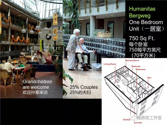 這個(gè)項(xiàng)目就是引出我今天要講的一個(gè)重要方面——生活模式,荷蘭公寓樓的生活模式。這個(gè)模式強(qiáng)調(diào)的就是,其實(shí)很多老人不需要入住護(hù)理院的,絕大多數(shù)通過這樣的專門設(shè)施,實(shí)現(xiàn)就地養(yǎng)老是最理想的。這個(gè)項(xiàng)目時(shí)間很久了,是90年代在荷蘭鹿特丹的項(xiàng)目,項(xiàng)目本身就是采用這樣一個(gè)概念,老人可以就地老化,不要再搬出去了。這個(gè)項(xiàng)目居室情況是很有特點(diǎn)的,首先是為終身生活而設(shè)計(jì),面積非常大,可以個(gè)性化的進(jìn)行裝飾,很多老人在里面裝了非常多的書、收藏品等等。另外還有小的房間是給訪客居住使用的。