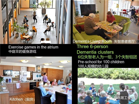 像這種類型的項(xiàng)目很難解決的問題就是對(duì)失智、獨(dú)居的老人進(jìn)行照顧。為此,我們不得不建立專門的建筑單元進(jìn)行失智老人的照顧,6個(gè)老人一組,共3個(gè)組團(tuán),同時(shí)這個(gè)部分也采用了老少合居的方式建了幼兒園。