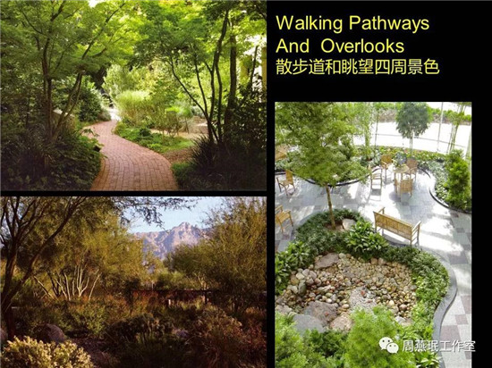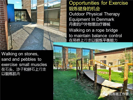 以上內(nèi)容都是體現(xiàn)如何讓景觀對(duì)老人起到作用的。景觀對(duì)于骨密度、日常拉伸、老人認(rèn)知都有很好的作用。遠(yuǎn)景、近景相結(jié)合、水元素的運(yùn)用,不同的石子都可提供給老人鍛煉健身的機(jī)會(huì)。在設(shè)計(jì)中可根據(jù)實(shí)際情況加以考慮。