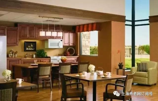 在餐廚房設(shè)計(jì)中,可以設(shè)置一個(gè)集中式廚房和餐廳,可以鼓勵(lì)認(rèn)知癥老人通過感官刺激找尋食物。多個(gè)團(tuán)組合的機(jī)構(gòu)中,食物可以在中央食堂供應(yīng),在每個(gè)團(tuán)內(nèi)均設(shè)置餐廳,這樣員工更容易照顧那些選擇用餐時(shí)間和根據(jù)自己吃飯節(jié)奏選擇的老人;