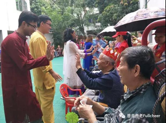 ▲普親養(yǎng)老院會(huì)定期為過生日的老人準(zhǔn)備生日會(huì),這一次正好是張爺爺?shù)纳�,國際友人的到來為張爺爺帶來了異域風(fēng)情的歌舞表演,戴上生日帽的張爺爺顯得精神十足。