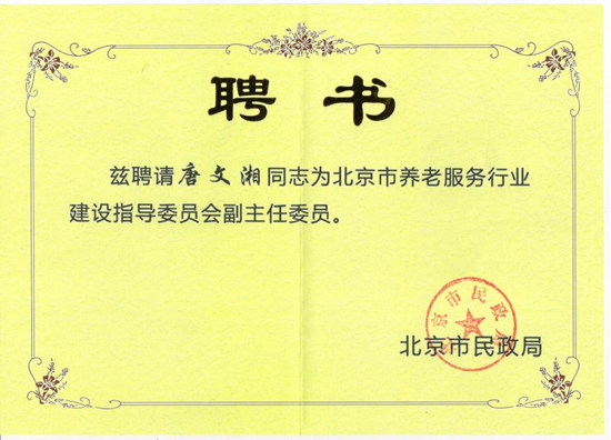 湖南普親老齡產(chǎn)業(yè)發(fā)展有限公司董事長(zhǎng)唐文湘先生,被聘請(qǐng)為北京市養(yǎng)老服務(wù)行業(yè)建設(shè)指導(dǎo)委員會(huì)副主任委員。