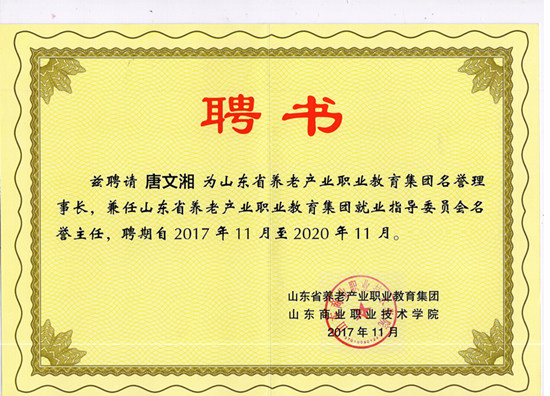 湖南普親老齡產(chǎn)業(yè)發(fā)展有限公司董事長(zhǎng)唐文湘先生,被聘請(qǐng)為山東養(yǎng)老產(chǎn)業(yè)職業(yè)教育集團(tuán)名譽(yù)理事長(zhǎng)。
