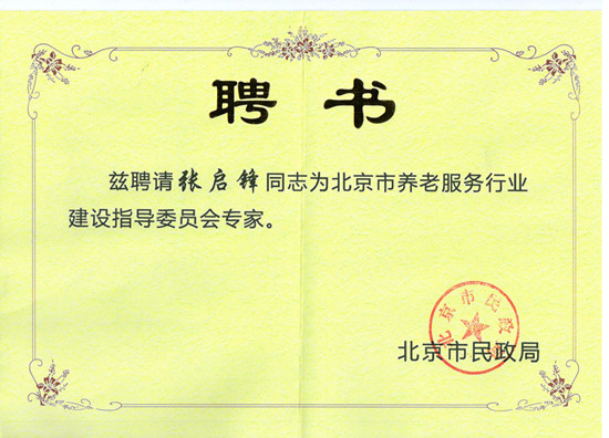 湖南普親老齡產(chǎn)業(yè)發(fā)展有限公司市場總監(jiān)張啟鋒先生,被聘請(qǐng)為北京養(yǎng)老服務(wù)業(yè)指導(dǎo)委員會(huì)專家證書。
