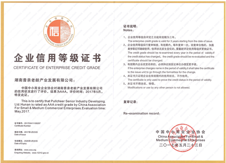 中國中小商業(yè)企業(yè)協(xié)會對湖南普親老齡產(chǎn)業(yè)發(fā)展有限公司的信用狀況進行了評價,結(jié)果為AAA。