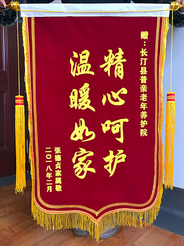 長(zhǎng)汀縣普親老年養(yǎng)護(hù)院張德貞家屬贈(zèng):“精心呵護(hù)·溫暖如家”錦旗!
